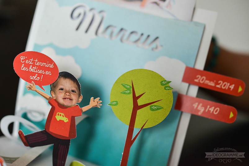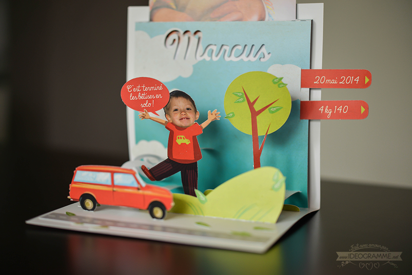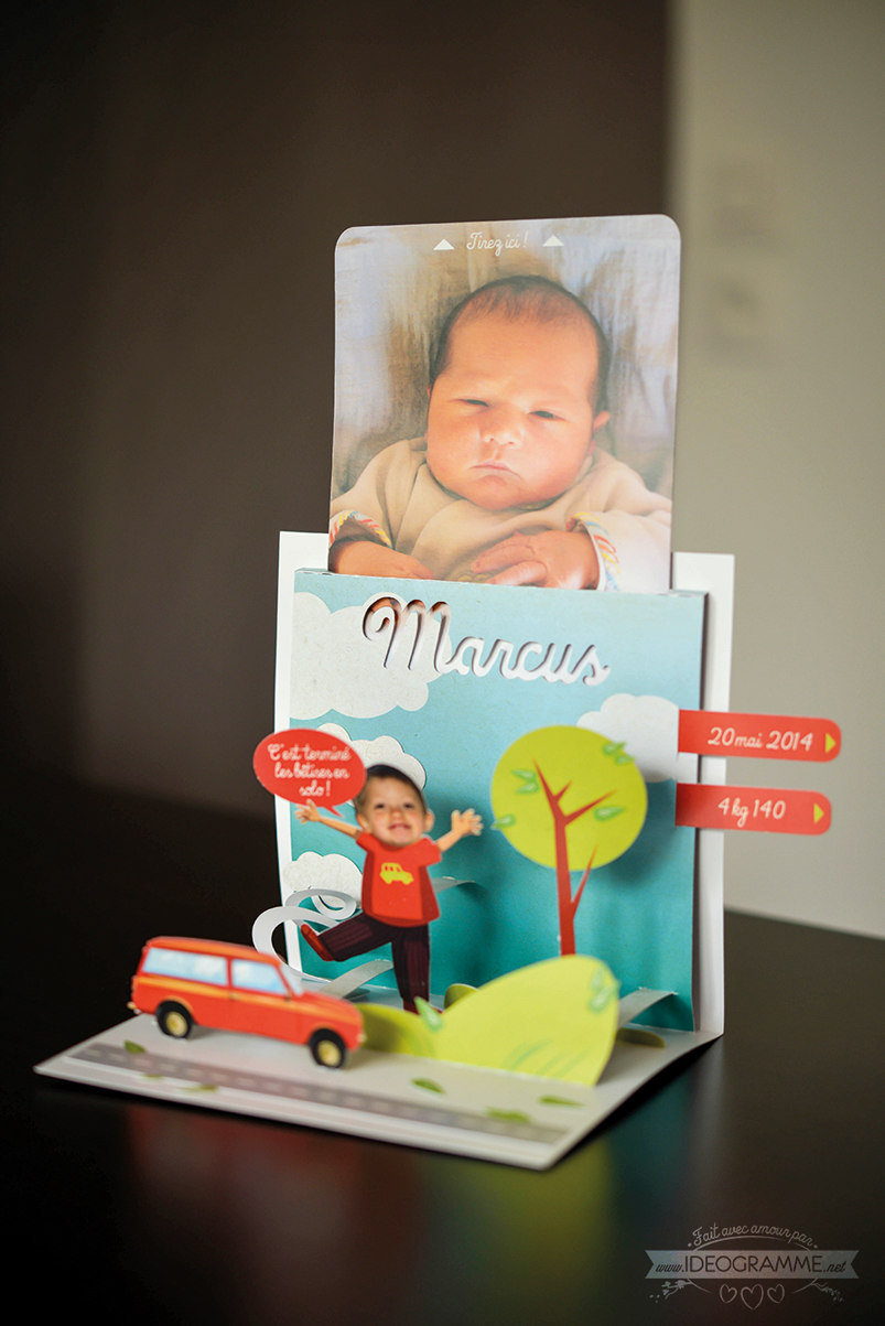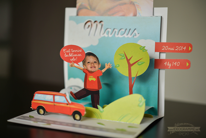Faire-part de naissance sur mesure. Illustration sur mesure. Système "pop-up". Papier découpé et assemblé.