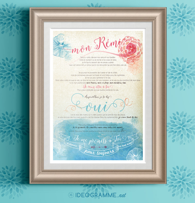 Mise en page et illustration des voeux prononcés d'une mariée envers son cher et tendre le jour de leur union.